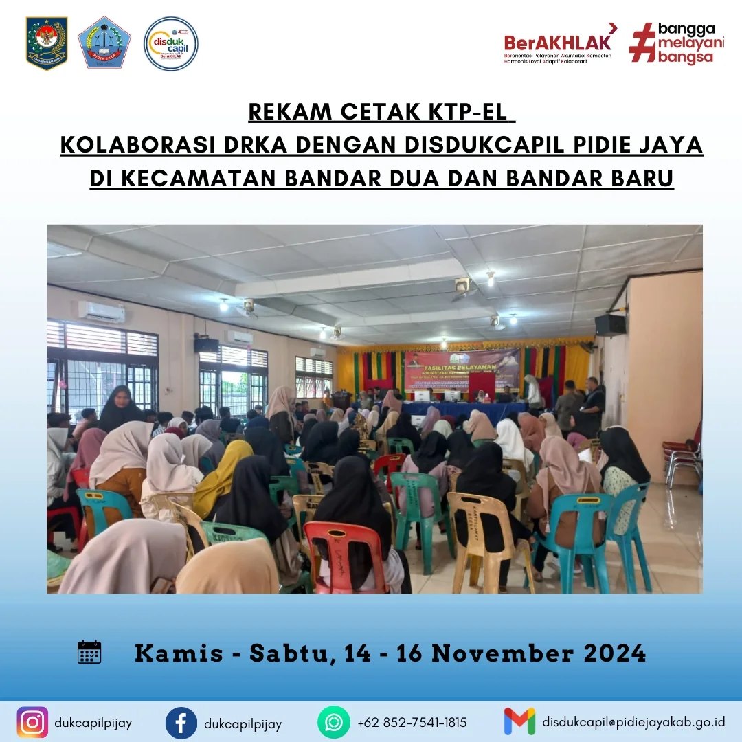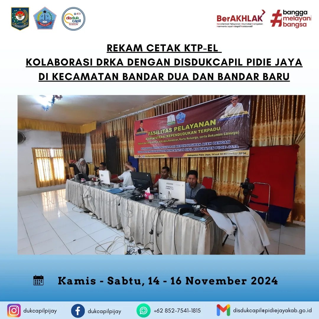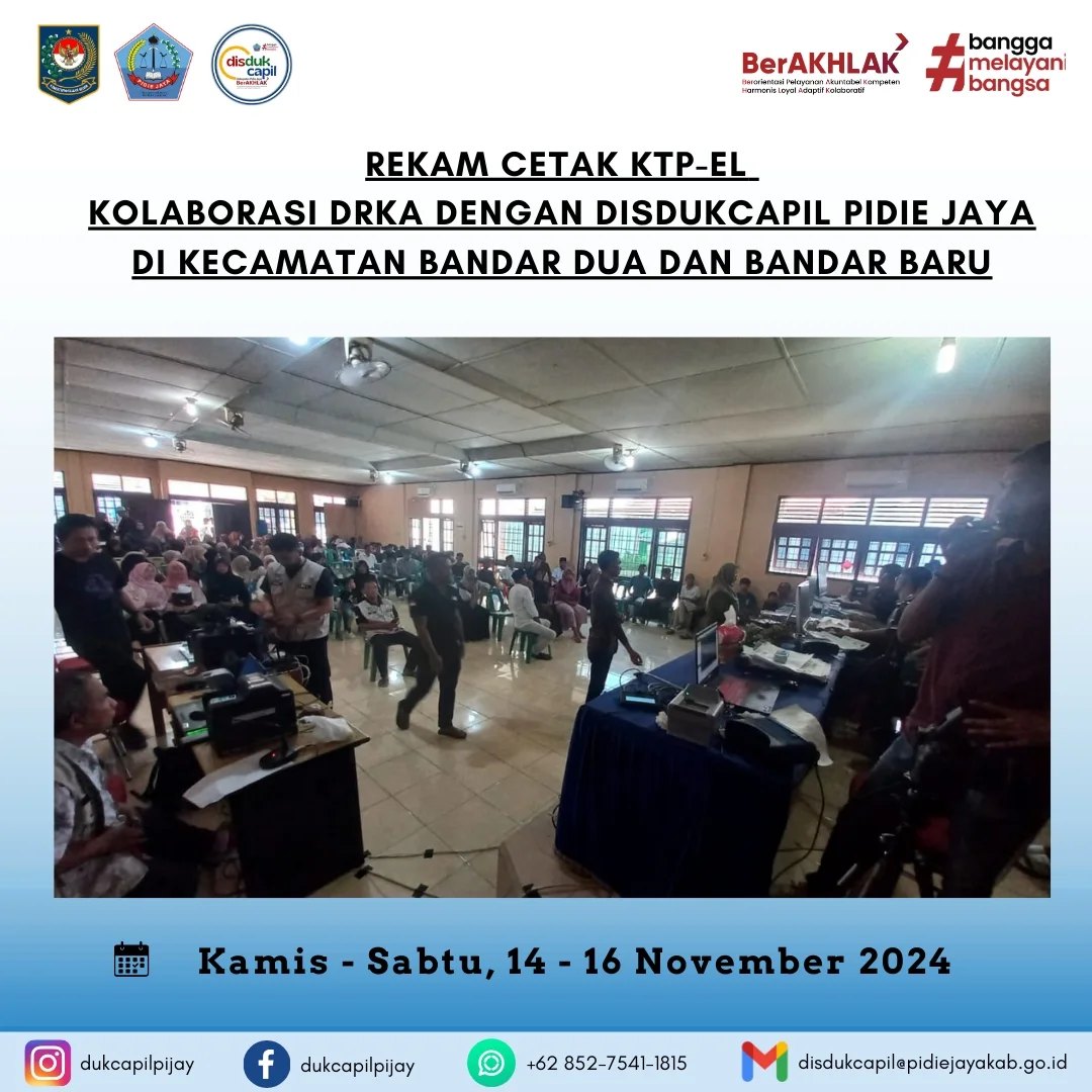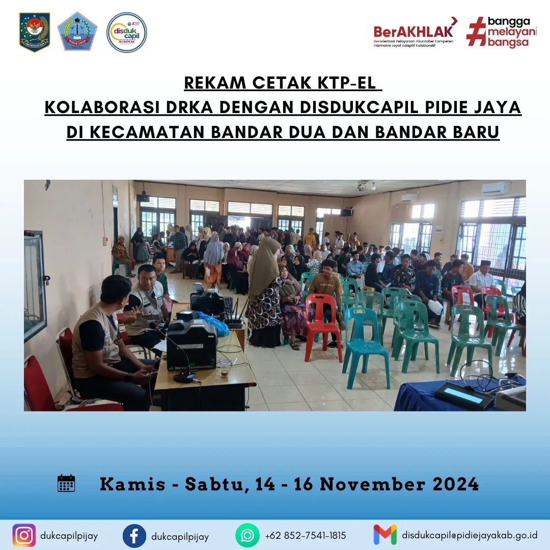 Dalam upaya mempermudah masyarakat mendapatkan dokumen kependudukan, Dinas Kependudukan dan Pencatatan Sipil (Disdukcapil) Kabupaten Pidie Jaya bekerja sama dengan Dinas Registrasi Kependudukan Aceh (DRKA) menggelar layanan rekam dan cetak KTP-el di Kecamatan Bandar Dua dan Bandar Baru.